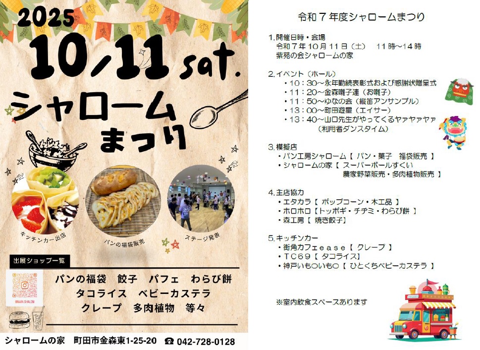 「シャロームまつり」今年もやりますよ! 2025 10/08 シャロームの家 2025年10月8日 シャロームの家 おまつり イベント シャロームの家 町田 よかったらシェアしてね! URLをコピーしました! URLをコピーしました! パン工房シャローム 臨時休業のお知らせ この記事を書いた人 sionnokai 関連記事 パン工房シャローム 臨時休業のお知らせ 2025年10月6日 9/12(金)防災訓練の為の電話等通信機器不通のお知らせ 2025年9月11日 紫苑の会後援会より「歌声ひろば」19周年チャリティーコンサート開催のお知らせ 2025年8月28日 パン工房シャローム 8月・9月の営業日程 2025年8月12日 パン工房シャロームより重要なお知らせとお詫び 2025年6月25日 町田市役所『ハッピーかわせみ』7月・8月販売日程 2025年6月19日 アルミ缶回収 始めました! 2025年6月9日 「パン工房シャローム」インスタグラムはじめました 2025年5月30日 コメント コメントする コメントをキャンセルコメント ※ 名前 ※ メール ※ サイト 次回のコメントで使用するためブラウザーに自分の名前、メールアドレス、サイトを保存する。 上に表示された文字を入力してください。