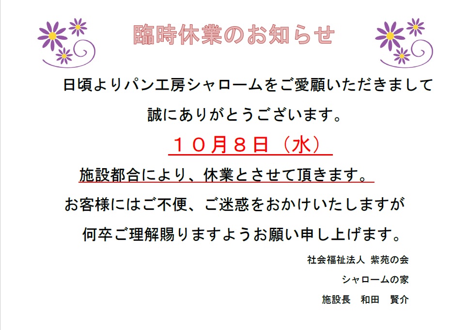 パン工房シャローム 臨時休業のお知らせ 2025 10/06 シャロームの家 パン工房 2025年10月6日 シャロームの家 パン工房 シャロームの家 パン工房 臨時休業 よかったらシェアしてね! URLをコピーしました! URLをコピーしました! 9/12(金)防災訓練の為の電話等通信機器不通のお知らせ 「シャロームまつり」今年もやりますよ! この記事を書いた人 sionnokai 関連記事 「シャロームまつり」今年もやりますよ! 2025年10月8日 9/12(金)防災訓練の為の電話等通信機器不通のお知らせ 2025年9月11日 紫苑の会後援会より「歌声ひろば」19周年チャリティーコンサート開催のお知らせ 2025年8月28日 パン工房シャローム 8月・9月の営業日程 2025年8月12日 パン工房シャロームより重要なお知らせとお詫び 2025年6月25日 町田市役所『ハッピーかわせみ』7月・8月販売日程 2025年6月19日 アルミ缶回収 始めました! 2025年6月9日 「パン工房シャローム」インスタグラムはじめました 2025年5月30日 コメント コメントする コメントをキャンセルコメント ※ 名前 ※ メール ※ サイト 次回のコメントで使用するためブラウザーに自分の名前、メールアドレス、サイトを保存する。 上に表示された文字を入力してください。