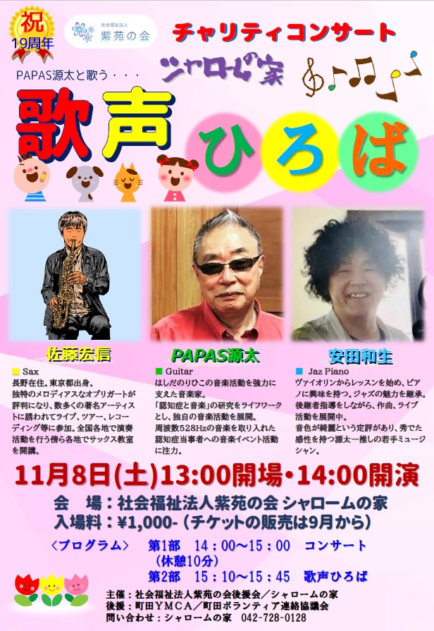 2025年11月8日(土)シャロームの家にてチャリティーコンサート を開催いたします。シャロームの家は、開設から20年が経過し、来年2026年には大規模修繕工事を予定しております。今回のチャリティーコンサートは、収益金の一部を大規模修繕工事資金として寄付されます。ぜひ皆様のご来場お待ちしております。